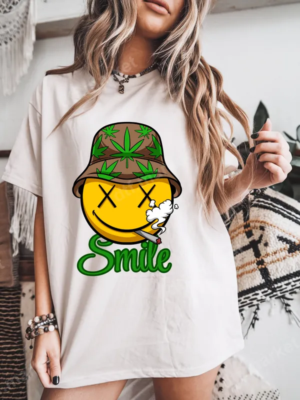 See allThis vibrant DTF transfer features a playful yet edgy design, showcasing a yellow smiley face with "X" eyes, sporting a cool brown bucket hat adorned with green marijuana leaves. A lit joint dangles from its mouth, puffing out a cloud of smoke, while the word "Smile" is boldly rendered in a matching green script below. It's a fun, ready to press design perfect for adding a relaxed, humorous touch to any garment. This unique design is ideal for those with a laid-back attitude, cannabis enthusiasts, or anyone who appreciates adult humor and streetwear style. It makes a fantastic gift for friends, family, or yourself for casual wear, 4/20 celebrations, music festivals, parties, or just chilling out. Perfect for adding personality to your wardrobe or creating custom gifts for like-minded individuals. Applying this heat transfer is incredibly easy. Designed for a professional finish, it works seamlessly on a wide variety of materials including cotton, polyester, and their blends. Simply use a standard heat press at 300-325°F for 15 seconds with medium pressure. For best results, use a firm, even press. The best part? There's absolutely no weeding required, making your customization process quick and hassle-free. This ready to press transfer is truly user-friendly. Crafted using premium direct to film transfer technology, this apparel transfer ensures outstanding quality and durability. Expect vivid colors that pop, a finish that is highly crack-resistant, and a remarkably soft hand feel that seamlessly integrates with the fabric. Each heat press design is printed on professional-grade DTF film with a strong, reliable adhesive for long-lasting wear.