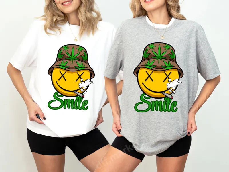 See allThis vibrant DTF transfer features a unique stoner smiley face, complete with X-shaped eyes, a stylish bucket hat adorned with bright green marijuana leaves, and a lit joint emitting smoke. Below the cheerful yet relaxed face, the word "Smile" is written in a playful, flowing green script. This eye-catching heat transfer captures a fun, laid-back vibe, perfect for anyone looking to express a chilled-out attitude. It's a ready to press design, ensuring you can quickly and easily add this distinct artwork to your favorite garments. This design is ideal for cannabis enthusiasts, streetwear lovers, or anyone who appreciates a playful, edgy aesthetic. It’s perfect for casual wear, music festivals, hangouts with friends, or as a statement piece for 4/20 celebrations. This shirt design also makes a fantastic, humorous gift for friends, family members, or anyone with a good sense of humor who enjoys cannabis culture. Whether for a birthday or just because, this design brings a smile to any recipient. Our direct to film transfer works seamlessly on a wide range of fabrics, including cotton, polyester, and various blends. Applying your design is straightforward: use a heat press set to 300-325°F for 15 seconds with medium pressure, then perform a cold peel. For those without a professional heat press, a household iron can also be used with careful application. There's no complex weeding or layering required, making these iron on decals incredibly user-friendly for all skill levels. Experience professional-grade quality with our DTF transfers. Each image boasts vibrant, true-to-color pigments that resist cracking, peeling, and fading, ensuring your garment looks fantastic wash after wash. The soft-to-the-touch finish integrates beautifully with the fabric, providing a comfortable feel. Crafted using premium DTF film and strong adhesive, these heat press designs offer superior durability and a high-quality finish for all your custom apparel needs.