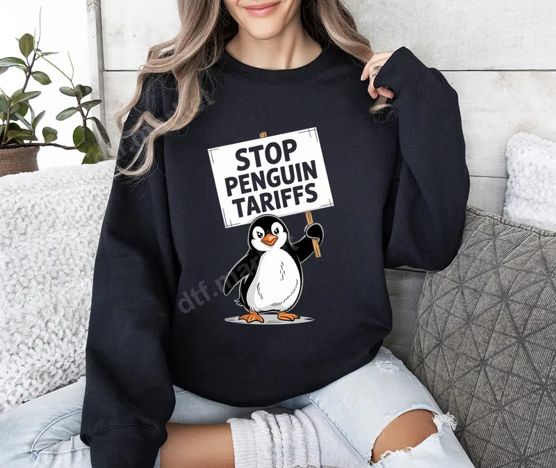 See allDive into quirky humor with our "Stop Penguin Tariffs" DTF transfer, featuring an adorable yet determined penguin holding a protest sign. This unique design blends cute aesthetics with satirical wit, perfect for sparking conversation. It's a premium direct to film transfer, offering vibrant colors and crisp details. Get this ready to press transfer and add unexpected charm to your wardrobe or craft projects. This funny heat transfer is ideal for anyone who loves whimsical designs, political satire, or a good laugh. Perfect for gifting to friends, family, or colleagues who appreciate unique, lighthearted humor. Wear it to casual gatherings, comedy nights, or as an everyday statement piece. It’s also a fantastic iron on transfer for crafters creating custom t-shirts, sweatshirts, or tote bags. Applying this high-quality t-shirt transfer is incredibly easy. Use a heat press at 300-325°F for 15 seconds with medium pressure. For those without a professional press, a household iron can also be used carefully. Our heat press ready transfers require no weeding, cutting, or layering, making customization quick and hassle-free. Full instructions are provided for a perfect application. Crafted from professional-grade DTF film, this heat press design ensures brilliant color retention and exceptional durability. The print is crack-resistant, highly flexible, and incredibly soft to the touch, providing a comfortable feel on any garment. The strong adhesive guarantees a long-lasting finish that withstands countless washes, maintaining its vibrant appeal. Enjoy a professional-quality finish that looks and feels premium.