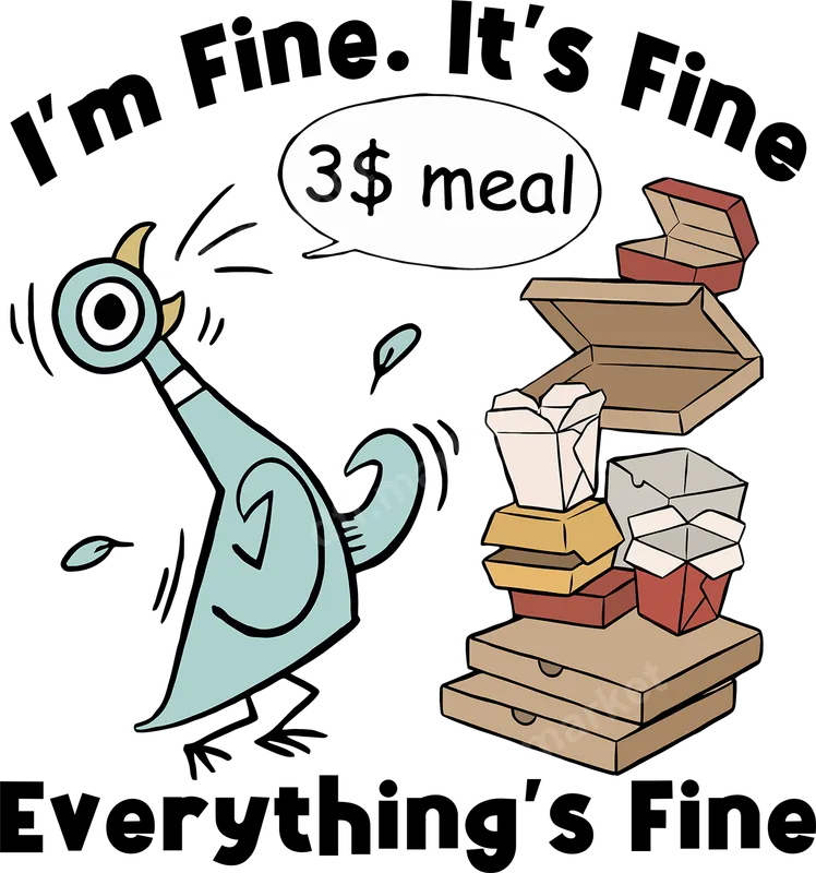 See allThis hilarious DTF transfer features a frantic cartoon pigeon next to a towering stack of empty takeout boxes, exclaiming "3$ meal" in a speech bubble. Below and above the scene, the text ironically declares, "I'm Fine. It's Fine. Everything's Fine." This ready to press design perfectly captures the relatable chaos and modern struggles of adulting with a healthy dose of humor. It's a vibrant direct to film transfer that's sure to resonate. Ideal for anyone who appreciates meme culture, sarcastic humor, or simply needs a laugh about everyday financial realities. This heat press transfer makes a fantastic gift for college students, young professionals, or anyone navigating the "adulting is hard" phase. Perfect for casual wear, social gatherings, or as a unique present for friends who understand the struggle of making ends meet with a smile. Applying this versatile heat transfer is a breeze! Our professional-grade transfers work flawlessly on a wide variety of materials, including cotton, polyester, and cotton/poly blends. For best results, use a heat press at 300-325°F for 15 seconds with medium, even pressure. While a heat press is recommended for optimal adhesion and durability, a household iron can also be used with care. Best of all, there's no weeding required – just press and go! Expect vibrant colors and exceptional detail with every iron on transfer. Our premium DTF film ensures a durable, crack-resistant finish that feels soft to the touch, not heavy or stiff. The strong adhesive guarantees your shirt design will withstand countless washes without fading or peeling, maintaining its professional look. These apparel transfers offer superior quality for long-lasting wear.