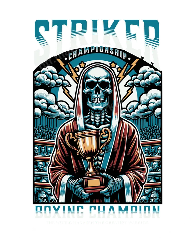 See allUnleash your inner champion with this striking DTF transfer featuring a skeletal boxer proudly holding a golden championship trophy. Set against a dramatic backdrop of a crowded boxing ring, stormy clouds, and crackling lightning, this design boldly proclaims "STRIKER BOXING CHAMPION." It’s a powerful and edgy graphic, ready to press onto your favorite apparel. This design is perfect for boxers, MMA enthusiasts, and anyone who appreciates the grind and glory of combat sports. It makes an excellent gift for gym-goers, trainers, fight fans, or those with a love for bold, street-style graphics. Ideal for wearing to the gym, a fight night, or simply showcasing your champion mindset in everyday casual wear, making it a truly unique iron on transfer. Applying this professional-grade heat transfer is simple. It works seamlessly on various fabrics, including cotton, polyester, and blends. Use a heat press at 300-325°F for 15 seconds with medium pressure, or follow instructions for a household iron. Best of all, there's no tedious weeding required, making custom apparel creation quick and easy with this direct to film transfer. Experience the exceptional quality of our DTF transfers. This high-quality t-shirt transfer boasts incredibly vibrant colors, crisp details, and superior durability. It’s crack-resistant, soft to the touch, and designed for long-lasting wear. Our premium DTF film ensures strong adhesion and a professional finish every time, delivering a heat press ready design that truly stands out.