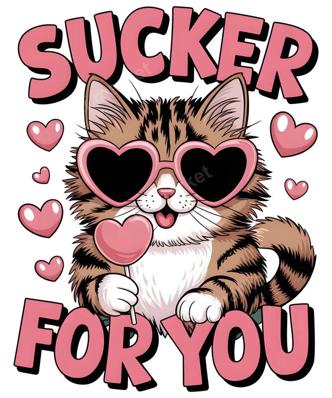 See allThis charming DTF transfer features an irresistibly cute tabby cat wearing pink heart-shaped sunglasses, happily holding a heart lollipop, surrounded by tiny floating hearts. The playful text "SUCKER FOR YOU" in bold pink lettering perfectly captures a sweet, affectionate sentiment. This delightful direct to film transfer is ready to press, making it effortless to add a touch of adorable romance to any item. Its vibrant colors and whimsical design create an instant conversation starter. Ideal for cat lovers, significant others, friends, or anyone who appreciates a cute and quirky expression of love. This heat press design is perfect for Valentine's Day, anniversaries, birthdays, or "just because" gifts. Create personalized items for your girlfriend, boyfriend, wife, husband, or best friend. It's also a fantastic choice for unique apparel, adding a playful romantic touch to everyday wear. Applying this ready to press transfer is a breeze for both beginners and experienced crafters. It works beautifully on a wide range of fabrics including cotton, polyester, and various blends, ensuring versatility for your projects. Simply use a heat press at 300-325°F for 15 seconds with medium pressure, then perform a cold peel. No weeding or layering is required. For household iron users, press firmly and evenly without steam. Crafted with premium DTF film, this professional apparel transfer delivers exceptional quality and durability. The colors are incredibly vibrant, sharp, and designed to resist cracking or fading, even after multiple washes. Enjoy a soft, smooth feel on your finished garment. Our strong adhesive ensures your unique iron on decal will stay put, making your custom creations last.