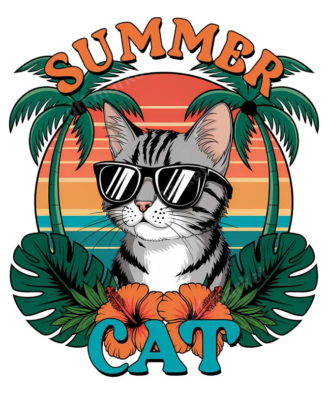See allThis vibrant "Summer Cat" DTF transfer brings a playful, tropical vibe to any garment. Featuring a cool tabby cat in sunglasses, framed by palm trees, hibiscus flowers, and a retro striped sunset, this design is perfect for those who love felines and sunshine. It's a ready to press transfer that captures the essence of a relaxed summer day, making it an instant favorite for custom apparel. Ideal for cat lovers, beach enthusiasts, and anyone looking to add a fun, casual touch to their wardrobe. This versatile heat transfer makes a fantastic gift for birthdays, summer vacations, or simply to celebrate a love for cats. Crafters and small business owners will find this an excellent choice for creating unique items for their customers, from personalized t-shirts to tote bags. Applying this direct to film transfer is incredibly easy, compatible with a wide range of materials including cotton, polyester, and various blends. For professional results, use a heat press at 300-325°F for 15 seconds with medium pressure. It can also be applied with a household iron. No weeding is required, saving you significant time and effort compared to traditional vinyl transfer methods. Our premium quality heat press transfers boast vibrant colors and sharp details, ensuring your finished product looks professional and lasts wash after wash. The design is crack-resistant and feels soft to the touch. Each iron on transfer is printed on durable DTF film with a strong adhesive, providing excellent adhesion and a long-lasting finish that truly pops.