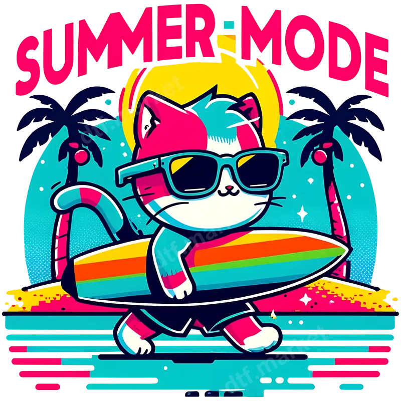 See allDive into summer with our eye-catching Summer Mode Surfing Cat DTF Transfer! This vibrant direct to film transfer features an adorable, sunglasses-wearing cat confidently carrying a colorful surfboard across a sunny beach, flanked by swaying palm trees. The bold "SUMMER-MODE" text perfectly captures the relaxed, playful vibe. With its lively neon colors and crisp details, this design is a ready to press statement piece, perfect for anyone dreaming of warm sands and ocean breezes. This fun and playful heat press design is ideal for cat lovers, beach enthusiasts, and anyone who wants to bring a touch of summer fun to their wardrobe. It's perfect for summer vacations, beach parties, family trips, or simply embracing sunny days. A fantastic gift for teens, kids, or adults who appreciate cute animals and a laid-back lifestyle, it’s a versatile design that brings smiles wherever it goes. Applying this high-quality iron on transfer is incredibly easy, making it accessible for both beginners and experienced crafters. It adheres beautifully to a wide range of fabrics, including cotton, polyester, and various blends. For best results, use a heat press at 300-325°F for 15 seconds with medium pressure. You can also achieve great results with a household iron. Best of all, there's no weeding required, saving you time and effort. Our professional-grade ready to press transfer ensures a stunning, durable finish. Expect vibrant, fade-resistant colors that pop, along with a soft, flexible feel that won't crack or peel over time. Each t-shirt transfer is produced using premium DTF film and strong adhesive, guaranteeing a professional-looking result on your apparel. Transform your garments and accessories with this durable and charming apparel transfer.