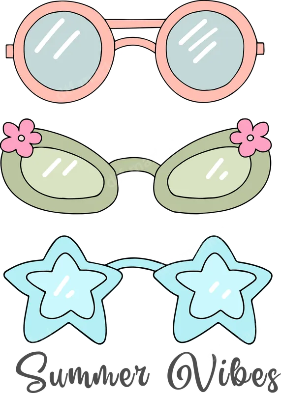 See allThis playful DTF transfer captures the essence of a perfect sunny day with its "Summer Vibes" typography and a delightful trio of cartoon-style sunglasses. Featuring classic round frames, a chic cat-eye pair adorned with a cute pink flower, and fun star-shaped shades, this design brings a cheerful, retro aesthetic to any garment. It's a vibrant, ready to press transfer that’s ideal for adding a touch of laid-back summer fun to your apparel. Perfect for summer enthusiasts, beach lovers, vacationers, or anyone who loves cute and nostalgic styles. This heat press design makes an excellent personalized gift for birthdays, summer parties, or just because. Use this iron on transfer to create custom gifts for friends, family, or even for your small business's summer collection. It's fantastic for crafters looking to add unique shirt designs to their projects. Our high-quality direct to film transfers are incredibly easy to apply, compatible with cotton, polyester, and various blends. Achieve professional results using a heat press set at 300-325°F for 15 seconds with medium pressure, or apply with a household iron. Forget about tedious weeding; these heat press ready designs are peel-and-press, making customization quick and hassle-free for everyone. Experience the superior quality of DTF.market transfers. Each apparel transfer boasts vibrant colors, excellent wash durability, and a soft, flexible feel that won't crack or peel. Printed on premium DTF film with strong adhesive, your custom transfer will look fantastic and last for countless wears and washes, bringing joyful summer vibes season after season.