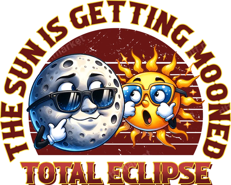 See allThis hilarious "The Sun Is Getting Mooned TOTAL ECLIPSE" DTF transfer captures the cosmic humor of a total solar eclipse. Featuring a cool, sly moon sporting sunglasses alongside a comically surprised sun, this ready to press design is perfect for celebrating this unique astronomical event. The vibrant artwork is set against a distressed circular background, making it an eye-catching statement piece for any garment. Ideal for anyone fascinated by the solar eclipse, astronomy enthusiasts, or those who appreciate a good laugh, this heat press transfer makes a fantastic conversation starter. It's perfect for wearing to eclipse viewing parties, science events, or as a fun, everyday apparel transfer. This design also makes a unique gift for friends, family, or fellow space lovers who enjoy a touch of humor with their celestial observations. Applying this high-quality iron on decal is simple and efficient. It works beautifully on a variety of fabric types, including cotton, polyester, and their blends. For best results, use a heat press at 300-325°F for 15 seconds with medium, even pressure. This shirt design can also be applied with a household iron, ensuring accessibility for all crafters. Best of all, there's no weeding required, saving you time and effort. Our professional direct to film transfer ensures a stunning, durable finish. Expect vibrant colors that pop, a soft hand feel that seamlessly blends with the fabric, and excellent crack resistance. The strong adhesive ensures your design stays put, making this a reliable and long-lasting addition to your custom apparel. Get a ready to press transfer that stands out!
