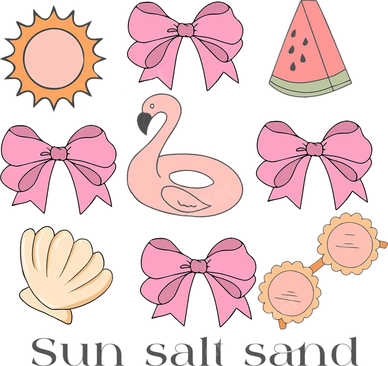 See allThis charming DTF transfer captures the essence of summer with delightful illustrations. It features a bright sun, a playful flamingo floaty, sweet pink bows, a refreshing watermelon slice, a delicate seashell, and stylish sunglasses, alongside the phrase 'Sun salt sand.' This vibrant, ready to press design boasts a soft, pastel color palette and a cute, whimsical style perfect for sunny vacation vibes. This heat transfer is ideal for anyone who loves the beach, summer fun, or feminine aesthetics. Perfect for custom apparel for beach trips, summer festivals, girls' getaways, or adding a cheerful touch to your wardrobe. Create unique gifts for friends, family, or treat yourself to personalized t-shirts, tank tops, or tote bags that radiate sunshine. Applying this direct to film transfer is incredibly easy and requires zero weeding. Use a heat press at 300-325°F for 15 seconds with medium pressure. A standard household iron also works great, making this apparel transfer accessible to all. It adheres beautifully to cotton, polyester, and various fabric blends, ensuring a professional finish. Experience exceptional quality with our premium DTF transfers. Each heat press design uses professional-grade DTF film, ensuring vibrant colors and outstanding durability. The final iron on decal is soft, crack-resistant, and engineered to withstand numerous washes without fading or peeling. Create long-lasting, high-quality custom garments with confidence.