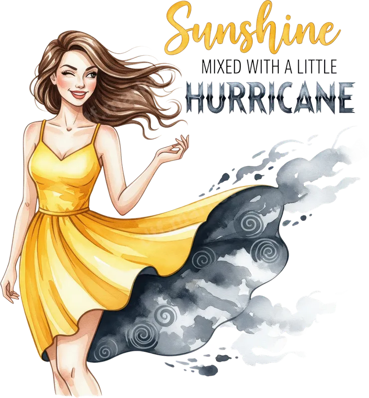 See allThis captivating DTF transfer features a confident, winking woman with flowing hair, elegantly dressed in a vibrant yellow gown. Her dress gracefully transforms into a swirling, stormy grey cloud motif, perfectly illustrating the phrase "Sunshine Mixed With A Little Hurricane." It’s a powerful visual representation of a multifaceted personality – sweet and bright, yet strong and spirited. This ready to press design brings a unique blend of charm and fierce attitude to any apparel. This heat transfer design is ideal for anyone who embodies this dynamic personality or knows someone who does. It makes a fantastic gift for friends, sisters, mothers, or anyone celebrating their unique spirit. Perfect for everyday wear, casual outings, girls' trips, or as a fun statement piece, this versatile design resonates with strong, independent women who aren't afraid to show both their gentle and powerful sides. Applying this t-shirt transfer is incredibly easy with a heat press. Press at 300-325°F for 15 seconds with medium pressure, then allow to cool completely before a cold peel. For those without a professional press, a household iron can also be used with care. There's no weeding required, making it a hassle-free iron on experience for customizing cotton, polyester, and blend fabrics. Experience professional quality with this durable apparel transfer. Our direct to film transfers boast vibrant colors, excellent wash durability, and a soft-hand feel that won't crack or fade. Each design is printed using premium ink on professional-grade DTF film, ensuring strong adhesion and a long-lasting, eye-catching finish that stands up to countless adventures.