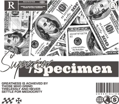 Unleash your inner hustler with this striking 'Superior Specimen' DTF transfer. This bold design features a dynamic collage of black and white hundred-dollar bills, juxtaposed with the stylized text "Superior Specimen" and an intriguing "RESTRICTED R" rating symbol. The powerful motivational quote, "GREATNESS IS ACHIEVED BY THOSE WHO GRIND TIRELESSLY AND NEVER SETTLE FOR MEDIOCRITY," anchors the piece, making it a perfect statement for anyone driven by ambition. This ready to press design is a must-have for urban fashion and grind culture enthusiasts.