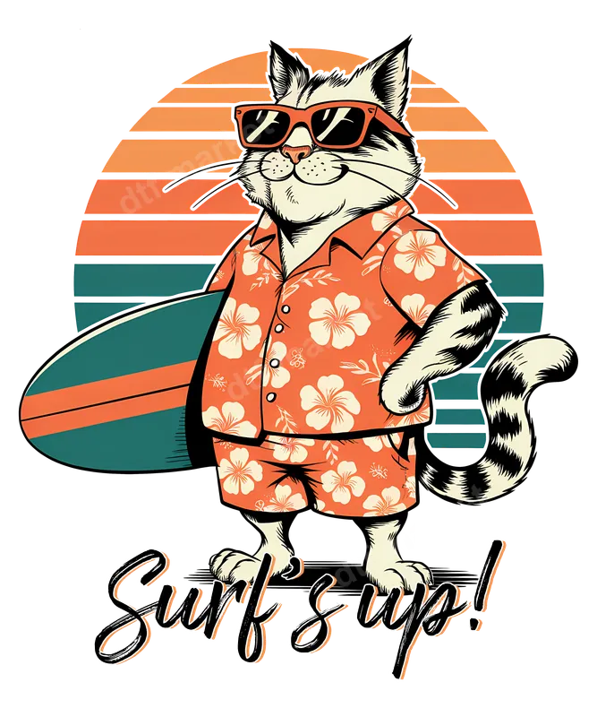 Surf Cat DTF Transfer - Retro Hawaiian Shirt & Surfboard Design