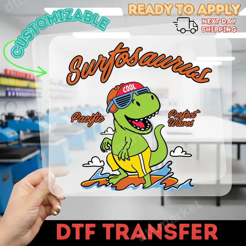 See allThis vibrant "Surfosauraus" DTF transfer features a super cool T-Rex, sporting sunglasses and a "COOL" hat, skillfully riding a surfboard amidst "Pacific Perfect Waves." With its playful cartoon style and bold colors, this heat press ready design instantly captures the joyful, laid-back vibe of summer beach days. It's a fantastic ready to press transfer for anyone looking to add a touch of prehistoric fun to their apparel. This unique iron on transfer is perfect for surf enthusiasts, dinosaur lovers, and anyone who enjoys a whimsical twist on beach themes. It makes an excellent addition to kids' and teens' wardrobes, ideal for summer vacations, beach trips, or simply showcasing a love for surfing. Create custom t-shirts for family holidays, fun birthday gifts, or school events, ensuring smiles and compliments wherever it goes. Applying this apparel transfer is a breeze on a variety of fabrics, including cotton, polyester, and their blends. For best results, use a heat press at 300-325°F for 15 seconds with medium pressure, followed by a cool peel. A household iron can also be used with careful application. Unlike traditional vinyl transfer, our DTF transfers require no weeding, making customization quick and effortless for a professional finish. Crafted with premium DTF film, this direct to film transfer boasts exceptional durability and a soft, flexible feel that resists cracking and fading after many washes. The colors remain vibrant and true, ensuring your custom garment stands out. Experience professional-grade results with our high-quality transfers, designed to bring your apparel ideas to life with ease and style.