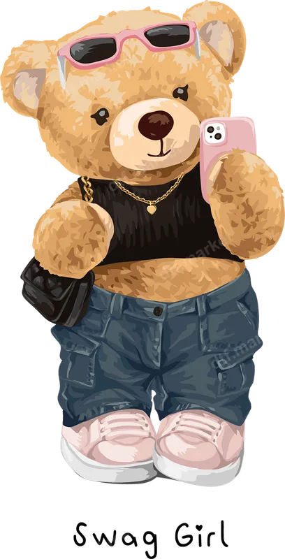 See allThis eye-catching DTF transfer features a super cool "Swag Girl" teddy bear, dripping with style. Our adorable bear sports pink sunglasses, a chic black crop top, a gold chain, baggy cargo jeans, and trendy pink sneakers, all while snapping a selfie with a matching pink phone. Below the bear, the playful "Swag Girl" text completes this vibrant and fashionable design, making it a perfect ready to press statement piece for any garment. This unique heat transfer is ideal for anyone who loves streetwear fashion, cute animal graphics with an edge, or wants to add a touch of personality to their wardrobe. It's perfect for teenagers, young adults, or anyone looking for a fun and trendy graphic. Use this iron on decal to create personalized birthday gifts, standout casual wear, or unique custom transfers for friends and family. Applying this professional-grade apparel transfer is quick and easy. Designed for a standard heat press, it adheres perfectly to cotton, polyester, and various fabric blends. Simply press at 300-325°F for 15 seconds with medium pressure, then cold peel. For household iron users, ensure even, firm pressure. Best of all, there's absolutely no weeding required, saving you time and effort. Experience superior quality with our DTF film. This durable shirt design boasts vibrant, true-to-color inks that resist cracking, peeling, and fading, ensuring your garment looks fantastic even after many washes. The soft-touch finish means the design integrates smoothly with the fabric, providing comfort and a professional look that lasts. Get ready to elevate your style with this high-quality heat press design!