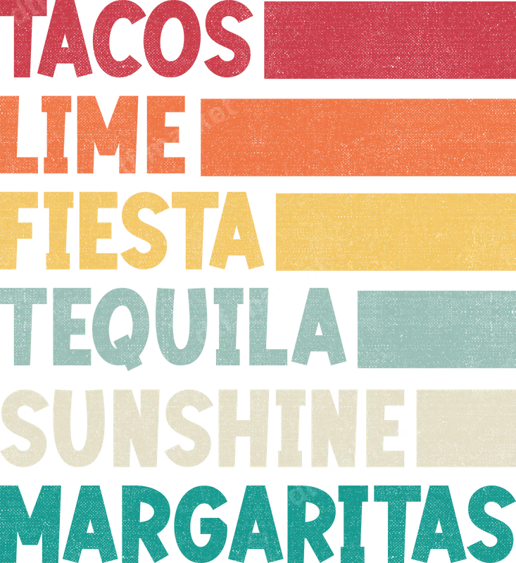 See allThis eye-catching DTF transfer features a vibrant, retro-inspired design listing the ultimate good-time essentials: TACOS, LIME, FIESTA, TEQUILA, SUNSHINE, and MARGARITAS. Each word is rendered in a distressed, blocky font with a unique, sun-faded color palette, evoking a nostalgic, laid-back vibe. This ready to press design is perfect for adding a burst of fun and flavor to any garment or accessory. Ideal for anyone who loves Mexican cuisine, festive gatherings, or simply embracing sunny, carefree moments, this design is a must-have. It’s perfect for celebrating Cinco de Mayo, summer parties, beach vacations, or just a casual day out. This fun heat transfer also makes a fantastic gift for foodies, margarita enthusiasts, or anyone who appreciates a good fiesta. Our premium DTF transfers are incredibly versatile and easy to apply. They adhere beautifully to a wide range of fabrics including 100% cotton, polyester, and cotton/poly blends. For best results, use a heat press at 300-325°F for 15 seconds with medium, even pressure. This iron on transfer requires no weeding or complicated layering, making customization quick and hassle-free. Experience professional-grade quality with every print. Our apparel transfers boast vibrant colors that pop, exceptional durability, and resistance to cracking and fading, even after multiple washes. The soft-touch feel ensures maximum comfort, while the strong adhesive backing provides a long-lasting finish that customers often mistake for a vinyl transfer due to its quality and ease of application.