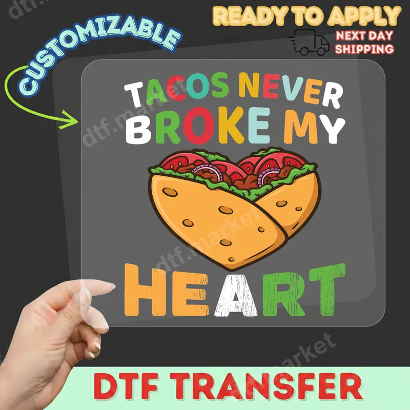 See allThis vibrant DTF transfer features the hilarious phrase 'TACOS NEVER BROKE MY HEART' in a playful, distressed font, complemented by an adorable graphic of two tacos artfully arranged to form a heart. This ready to press design combines a love for delicious food with a lighthearted, relatable sentiment, making it a perfect statement piece for anyone who appreciates a good laugh and good food. It’s an eye-catching design that expresses joy for everyone’s favorite meal. Ideal for anyone who truly understands the unwavering comfort of a good taco, this iron on transfer makes an excellent gift for foodies, taco lovers, friends, or family. Perfect for casual wear, Cinco de Mayo celebrations, backyard BBQs, or as a thoughtful birthday present. Elevate your everyday style or create unique apparel for group outings with this fun, relatable heat press design that brings a smile to everyone's face. Applying this shirt design is incredibly easy with a heat press at 300-325°F for 15 seconds with medium pressure, or you can even use a household iron for smaller batches. This high-quality direct to film transfer works beautifully on a wide range of fabrics including cotton, polyester, and their blends, ensuring versatility for all your custom apparel projects. Enjoy the convenience of no weeding or layering required, making DIY projects simple and fast. Our premium DTF transfers boast exceptional color vibrancy and a super-soft, flexible feel that seamlessly integrates with your garment. Designed for durability, this heat press transfer is crack-resistant and will withstand countless washes, keeping your apparel looking fresh and new. Crafted with professional-grade DTF film and strong adhesive, you can trust in a professional finish every time for your custom creations.