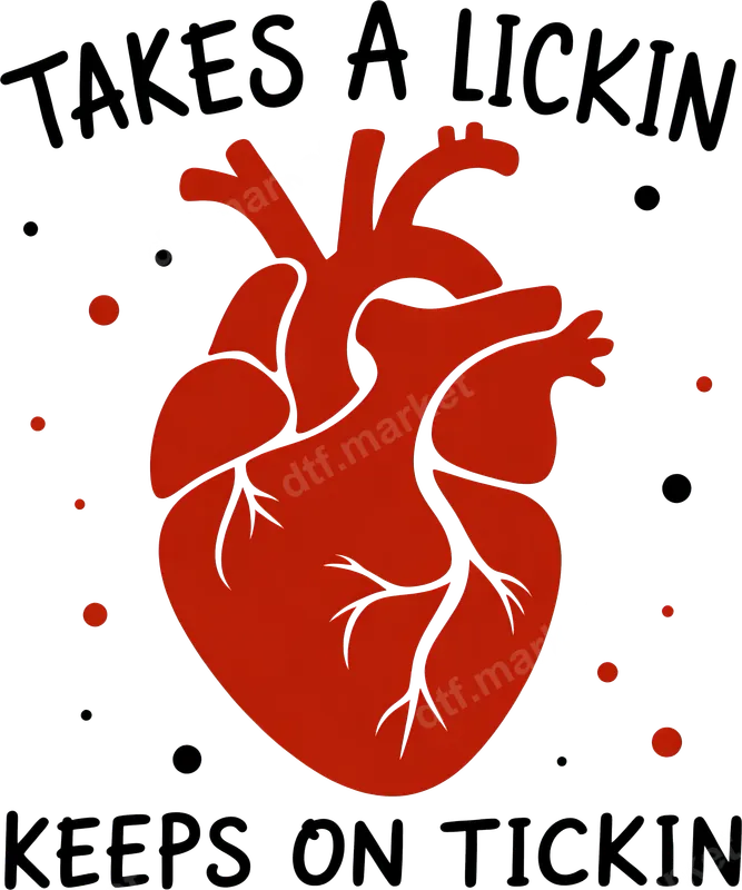 See allThis impactful DTF transfer features a bold anatomical red heart, surrounded by subtle black and red dots, with the classic phrase "TAKES A LICKIN'" above and "KEEPS ON TICKIN'" below. It embodies a spirit of resilience and enduring strength, making it a perfect ready to press design for anyone who perseveres. This design is ideal for individuals embodying strength and determination, including fitness enthusiasts, survivors, or anyone needing a daily reminder of tenacity. It's a thoughtful gift for friends and family overcoming challenges, for active wear, or for making a personal statement on everyday apparel. Perfect for motivational events, gym sessions, or just showcasing an unwavering spirit. Applying this heat press transfer is simple and efficient. It adheres beautifully to cotton, polyester, and blends. Use a heat press at 300-325°F for 15 seconds with medium pressure, then a warm peel. Unlike traditional vinyl transfer, there's no weeding required, making customization quick. This iron on transfer can also be applied with a high-quality household iron. Crafted with professional-grade DTF film, this t-shirt transfer ensures stunning, vibrant colors and exceptional durability. The design is crack-resistant, soft to the touch, and boasts strong adhesive for long-lasting wear. Our high-quality direct to film transfers maintain integrity and bright appearance wash after wash, providing a professional finish.