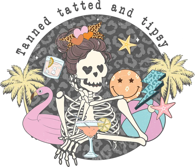 See allThis vibrant DTF transfer captures the ultimate summer vibe with a sassy twist, featuring a skeleton sporting a stylish leopard print headband, heart-shaped eyes, and a relaxed pose, holding a refreshing margarita. Surrounded by fun beach elements like palm trees, a flamingo floatie, and a beach ball, the design is crowned with the playful phrase "Tanned tatted and tipsy." This eye-catching, ready to press transfer brings a unique, retro-inspired aesthetic perfect for injecting personality into any garment. Ideal for anyone who loves summer, beach vacations, or a good party, this direct to film transfer is perfect for girls' trips, bachelorette parties, or simply celebrating the sunny season. It makes a fantastic gift for friends who appreciate a bit of humor and a relaxed attitude. Whether you're planning a cruise, a pool party, or just dreaming of warmer days, this design is your go-to for custom apparel. Our premium DTF heat press design is incredibly versatile, suitable for a wide range of materials including 100% cotton, 100% polyester, and cotton/poly blends. Application is a breeze: simply use a heat press at 300-325°F for 15 seconds with medium pressure, or apply with a household iron. Forget the hassle of weeding vinyl; this iron on transfer is ready to go right out of the package, ensuring a smooth and quick customization process. Experience professional-grade results with our high-quality custom transfer. Each design is printed with vibrant, long-lasting inks that resist cracking and fading, maintaining their brilliance wash after wash. The soft-to-touch finish ensures maximum comfort, while the strong adhesive guarantees your apparel transfer stays put. Get ready to effortlessly create custom shirts, hoodies, and more that stand out from the crowd.