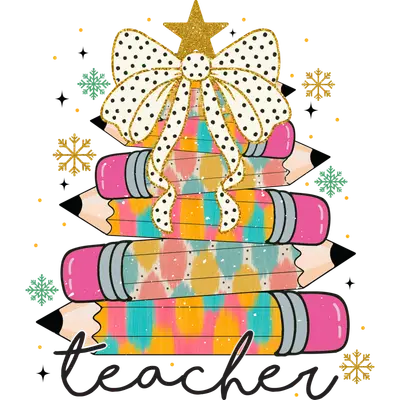 See allThis delightful DTF transfer features a whimsical Christmas tree creatively constructed from stacked, colorful pencils. Each pencil boasts a unique, abstract pattern in bright hues of pink, yellow, turquoise, and white, adorned with festive speckles. Topped with a shimmering gold glitter star and a charming white polka-dot bow, surrounded by delicate snowflakes, this design radiates holiday cheer. The word "teacher" is elegantly scripted below, making this a perfect ready to press piece for celebrating educators. This cheerful design is perfect for teachers, school staff, principals, and teaching assistants who love to show their festive spirit. It makes an exceptional iron on transfer for crafting personalized Christmas gifts, appreciation presents, or holiday party wear for educators. Small t-shirt businesses and crafters can easily create unique apparel for school events, teacher gatherings, or simply to express gratitude during the holiday season. It's a wonderful heat transfer design for anyone looking to celebrate the vital role of teachers. Our versatile heat press transfer works beautifully on a wide range of fabrics including cotton, polyester, cotton-poly blends, and even nylon. Application is simple: use a heat press at 300-325°F for 15 seconds with medium pressure, or apply with a household iron. Enjoy the convenience of no weeding – just peel and press! This design is ideal for custom t-shirts, cozy hoodies, festive sweatshirts, practical tote bags, charming pillow covers, and even durable denim jackets. For lasting durability, wash garments inside out and tumble dry low. Each ready to press transfer ensures vibrant, full-color printing with exceptional fine detail, bringing the design to life on any garment. Our high-quality direct to film transfer is crack-resistant and soft to the touch, avoiding the heavy, stiff feel often associated with vinyl. Printed on premium DTF film with a strong adhesive backing, these transfers guarantee professional, long-lasting results every single time, making your custom apparel stand out.