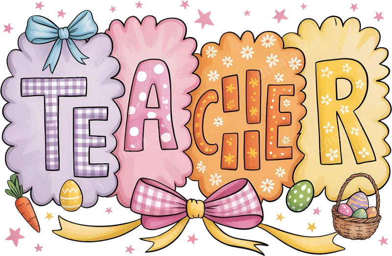 See allCelebrate your favorite educator with this adorable 'TEACHER' DTF transfer, perfect for spring! This vibrant design spells 'TEACHER' in charming pastel letters, adorned with playful patterns like gingham, polka dots, and tiny flowers. Surrounded by delicate bows, sparkling stars, carrots, and decorated Easter eggs, this direct to film transfer is ideal for teacher appreciation. It’s a ready to press design, making custom apparel creation simple and fun. This delightful heat transfer is ideal for showing gratitude to any special teacher, preschool educator, or daycare provider. Perfect for Easter baskets, end-of-year gifts, or Teacher Appreciation Week. Easily create custom t-shirts, cozy hoodies, or practical tote bags. This fantastic iron on transfer makes crafting personalized gifts from students or parents a breeze. Applying this professional heat press design is incredibly easy. Our high-quality DTF transfers work seamlessly on cotton, polyester, and blends. For best results, use a heat press at 300-325°F for 15 seconds with medium pressure. A household iron can also be used with firm, even pressure. Unlike vinyl transfers, there's no weeding required, saving time for quick projects. Experience superior print quality with our durable DTF transfers. Each image boasts vibrant colors and sharp details that stand out beautifully. The design is crack-resistant and feels soft to the touch, ensuring comfort and longevity. Crafted from professional-grade DTF film with strong adhesive, this apparel transfer is designed to withstand countless washes, keeping your custom creation looking fantastic.