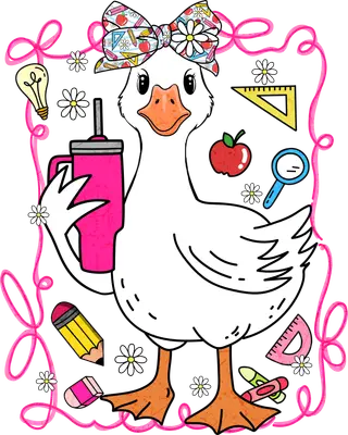 See allThis charming DTF transfer features an adorable white goose, adorned with a vibrant bow patterned with school supplies like pencils, apples, and rulers. Holding a trendy pink tumbler, this friendly feathered friend is surrounded by whimsical educational motifs including a lightbulb, magnifying glass, and crayons, all framed by a playful pink swirl. It's a delightful and colorful ready to press design perfect for celebrating the spirit of learning and teaching. This endearing heat transfer design is perfect for educators, students, and school staff who bring passion to the classroom. Imagine it on custom shirts for Teacher Appreciation Week, as a thoughtful gift for your favorite professor, or to add a touch of whimsy to back-to-school outfits. Small t-shirt businesses and crafters looking for unique iron on transfers for themed apparel will find this design irresistible for its universal appeal to the academic community. Applying this heat press transfer is a breeze; it works flawlessly on various materials like cotton, polyester, and blends, even nylon. Simply use a heat press at 300-325°F for 15 seconds with medium pressure, or apply with a household iron. There's no tedious weeding required—just peel and press for instant customization. It’s ideal for custom t-shirts, cozy hoodies, school tote bags, unique aprons, or even playful baby onesies. For lasting durability, wash garments inside out and tumble dry on low heat. Experience premium quality with every ready to press transfer. This direct to film transfer boasts vibrant, full-color printing that captures every fine detail of the cheerful goose and its educational accessories. The result is a crack-resistant, soft-to-the-touch finish that feels like part of the fabric, not a heavy vinyl overlay. Each apparel transfer is meticulously printed on high-grade DTF film with a strong adhesive backing, ensuring professional, long-lasting results for all your garment personalization projects.