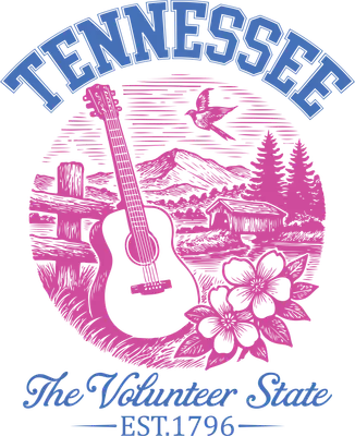 See allThis captivating DTF transfer celebrates Tennessee, 'The Volunteer State,' with a charming vintage-inspired design. Featuring the iconic state name in bold blue collegiate lettering, the artwork showcases a scenic pink-hued landscape with rolling mountains, tall pine trees, a rustic barn, and a flying bird. A prominent acoustic guitar takes center stage, flanked by delicate dogwood flowers, creating a perfect blend of state pride and country music heritage. This ready to press design evokes a warm, nostalgic feeling. Perfect for proud Tennesseans, country music enthusiasts, or anyone who loves the rustic charm of the South. This versatile iron on transfer makes an ideal gift for birthdays, Mother's Day, Father's Day, or souvenirs for those who cherish memories of Nashville, the Great Smoky Mountains, or Memphis. Small businesses and crafters looking for unique heat transfer designs will find this a popular choice for custom apparel and gifts celebrating state pride and musical roots. Applying this heat press transfer is a breeze on various fabrics like cotton, polyester, and blends. Use a heat press at 300-325°F for 15 seconds with medium pressure, or a household iron for smaller projects. No weeding is required – just peel and press! Create stunning custom t-shirts, cozy hoodies, stylish tote bags, unique denim jackets, or even personalized pillow covers. For best results and lasting durability, wash garments inside out in cold water and tumble dry on low heat. Our premium ready to press transfer boasts vibrant, full-color printing with exceptional detail, ensuring your designs truly pop. Experience a soft, flexible feel that resists cracking and peeling, far superior to traditional vinyl. Each direct to film transfer is produced on high-quality DTF film with a robust adhesive backing, guaranteeing professional, long-lasting results that will impress your customers or friends.