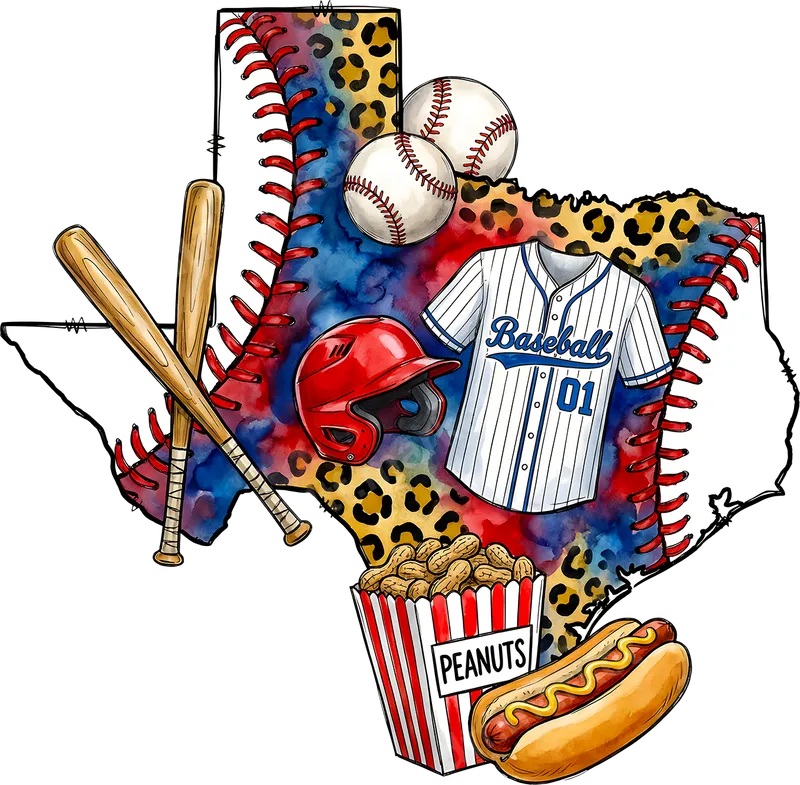 See allThis vibrant DTF transfer combines Texas state pride with a love for baseball. The design features the Texas outline, boldly filled with fierce leopard print, patriotic watercolor splashes of red and blue, and classic baseball stitching. Iconic elements like crossed bats, baseballs, a red helmet, a pinstriped jersey, peanuts, and a hot dog are layered on top. This striking, ready to press design perfectly captures the spirit of Texas baseball culture. This unique baseball heat transfer is ideal for Texas sports fans, players, coaches, and parents. Perfect for game days, sporting events, local league support, or casual wear, it also makes an excellent gift for birthdays, Father's Day, or any occasion for a baseball enthusiast. Show off your love for the Lone Star State and America's favorite pastime with this fun and energetic apparel transfer. Applying this direct to film transfer is straightforward and hassle-free. Our high-quality heat press design works beautifully on cotton, polyester, and various fabric blends. For best results, use a heat press at 300-325°F for 15 seconds with medium pressure, followed by a cold peel. A household iron can also be used. Enjoy the convenience of a ready to press iron on transfer with absolutely no weeding or layering required. Experience superior quality with our professional-grade DTF transfer. This t-shirt transfer delivers exceptionally vibrant colors that pop, ensuring your custom apparel stands out. Engineered for durability, it's crack-resistant and maintains its integrity wash after wash. The finish is soft to the touch, providing comfortable wear without a bulky feel. Each iron on decal is made with premium DTF film and strong adhesive, guaranteeing a professional and long-lasting result for all your garment projects.