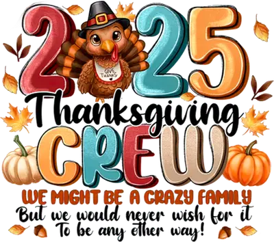 See allDive into the festive spirit of Thanksgiving 2025 with this charming DTF transfer! This design beautifully captures the essence of family togetherness and autumn cheer, featuring a delightful cartoon turkey adorned with a pilgrim hat and bib, surrounded by colorful fall leaves, ripe pumpkins, and the prominent year "2025." The playful text "Thanksgiving CREW WE MIGHT BE A CRAZY FAMILY But we would never wish for it To be any other way!" adds a touch of humor and warmth, making it a perfect ready to press design to celebrate the holiday season. This festive iron on transfer is ideal for anyone looking to create memorable matching family outfits for Thanksgiving dinner, fall festivals, or casual holiday gatherings. It’s perfect for the host family, grandparents, parents, and kids who love to show their unity with a funny and heartwarming statement. Small t-shirt businesses and Etsy sellers specializing in holiday apparel will find this heat transfer design an excellent addition to their inventory, offering a unique and popular item for the upcoming holiday season. It also makes a fantastic gift for loved ones who cherish family traditions and a good laugh. Applying this heat press transfer is a breeze! It works beautifully on a wide variety of materials including cotton, polyester, cotton-poly blends, and even nylon, ensuring versatility for your projects. Achieve professional results by applying with a heat press at 300-325°F for 15 seconds with medium pressure, or you can use a household iron with firm, even pressure. There's no tedious weeding required—simply peel and press! Use this custom t-shirt transfer to personalize t-shirts, hoodies, sweatshirts, tote bags, pillow covers, baby onesies, and aprons. For lasting durability, wash inside out and tumble dry low. Experience superior quality with this ready to press transfer. It boasts vibrant, full-color printing with exceptional detail, ensuring every element, from the turkey's feathers to the fall foliage, stands out. Our transfers are crack-resistant, soft to the touch, and avoid that heavy, stiff vinyl feel often found in other heat press designs. Each direct to film transfer is printed on premium DTF film with a strong, reliable adhesive backing, guaranteeing professional-grade results that will last through many holiday seasons.