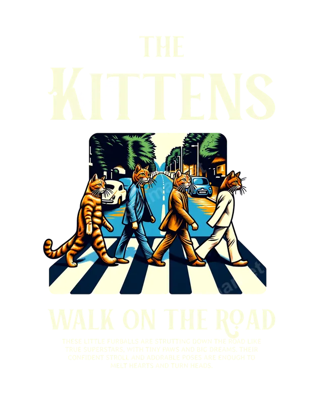 See allStep into the spotlight with 'The Kittens Walk On The Road' DTF transfer, a delightful and clever parody inspired by history's most iconic album covers. This eye-catching design features four dapper cats, each sporting unique attire, confidently strolling across a zebra crossing. It perfectly captures a retro, whimsical, and humorous vibe, making it an instant conversation starter. This ready to press heat transfer adds musical feline charm to any garment. This unique heat press design is a must-have for cat enthusiasts, Beatles fans, and anyone who appreciates a good pop culture reference. It makes an excellent gift for friends and family, ideal for birthdays, holidays, or just because. Perfect for everyday wear, music festivals, themed parties, or even as a standout piece for your own custom apparel brand. Show off your love for felines and classic rock with this purr-fectly designed apparel transfer. Our premium DTF transfer is incredibly versatile and can be applied to a wide range of fabric types, including cotton, polyester, and various blends. It's designed for easy application with a heat press, requiring temperatures between 300-325°F for 15 seconds with medium pressure. For hobbyists, it can also be effectively applied using a household iron, making it accessible for everyone. Best of all, there’s no weeding involved, saving you time and effort. Experience professional-grade quality with vibrant colors that truly pop and resist cracking, peeling, or fading wash after wash. Each iron on transfer is crafted using durable DTF film and strong adhesive, ensuring a soft feel and long-lasting adherence to your chosen garment. Elevate your wardrobe or merchandise with this high-quality, ready-to-apply shirt design that promises durability and stunning visual appeal.