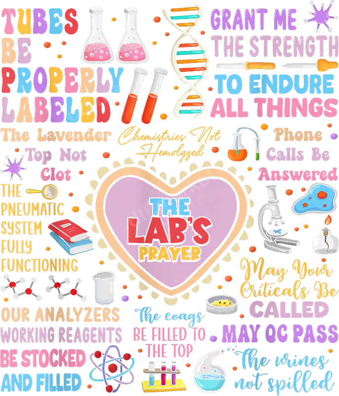 See allThis vibrant direct to film (DTF) transfer, "The Lab's Prayer," humorously captures the daily realities of laboratory life. Featuring a central heart with the main prayer, it's surrounded by colorful lab equipment like beakers, test tubes, and microscopes. Each element pairs with a relatable, witty lab-specific wish, such as "Tubes be properly labeled" and "Chemistries not hemolyzed." This ready to press design adds a lighthearted touch to the medical science world, perfect for custom apparel. This unique heat transfer is tailor-made for medical lab technologists, phlebotomists, clinical chemists, microbiologists, and any dedicated lab professional. It's an ideal gift for birthdays, appreciation days, science graduations, or just because. Show your lab team spirit or celebrate a hard-working friend with a custom t-shirt, tote bag, or personalized lab coat. It’s a fantastic conversation starter and a humorous way to display professional pride. Applying this heat press transfer is simple and efficient. Our high-quality iron on decal works seamlessly on cotton, polyester, and blends. For best results, use a heat press at 300-325°F for 15 seconds with medium, even pressure. While a heat press is recommended, a household iron can also be used. The best part? There’s no weeding or masking required, saving you time and effort to create your perfect garment. Experience superior quality with our professional-grade DTF transfer. Our direct to film transfers boast vibrant colors, exceptional wash durability, and resistance to cracking or peeling, ensuring your design looks great for years. The soft-touch finish integrates beautifully with your garment, providing comfort. Each apparel transfer is crafted from premium film with strong adhesive, designed to give you a long-lasting, retail-quality product every time.