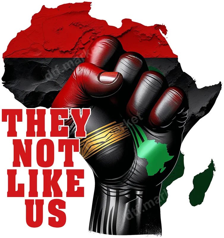See allThis impactful DTF transfer features a powerful raised fist, boldly displaying the iconic Pan-African colors of red, black, and green, set against the outline of the African continent. The design is emblazoned with the trending phrase "THEY NOT LIKE US" in striking red typography, making a strong statement. This ready to press design is perfect for customizing your apparel with a powerful message of pride and identity. Ideal for hip-hop enthusiasts, cultural advocates, and anyone who embraces unique identity, this heat press ready transfer is a statement piece for various occasions. Celebrate Juneteenth, Black History Month, cultural festivals, or simply express your individuality in daily streetwear. It makes an excellent gift for friends and family who appreciate bold, culturally resonant designs and stand firm in their convictions. Applying this vibrant heat press design to your favorite garments is straightforward. It works seamlessly on a wide range of materials including cotton, polyester, and their blends. For best results, use a heat press at 300-325°F for 15 seconds with medium pressure, or a household iron with firm, even pressure. This DTF transfer requires no weeding, ensuring a smooth, professional finish with minimal effort. Crafted using professional-grade DTF film, this apparel transfer promises exceptional durability and a brilliant, crack-resistant finish. The colors remain vivid wash after wash, and the transfer itself is soft to the touch, ensuring comfort. Experience the ease and quality of an iron on transfer that elevates your wardrobe with lasting style and a powerful message.