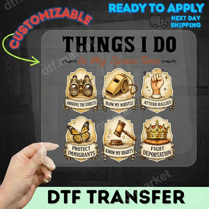 See allThe design is an activist themed collage: "Things I Do In My Spare Time." It features six vintage-style illustrations representing different aspects of civic engagement and social justice, including observing streets, blowing a whistle, attending rallies, protecting immigrants, knowing rights, and fighting deportation. This powerful direct to film transfer is perfect for expressing your commitment to advocacy. It's a ready to press design that speaks volumes without uttering a word. This unique design is ideal for social justice warriors, human rights advocates, immigration reform supporters, and anyone passionate about making a difference. It’s perfect for protest marches, community events, rallies, political gatherings, or as an everyday statement piece. This heat press ready transfer also makes a thoughtful gift for friends or family members who are actively involved in activism and fighting for a better world. Our premium DTF transfers are incredibly versatile and can be applied to a wide range of fabrics, including cotton, polyester, and various blends. For best results, use a heat press at 300-325°F for 15 seconds with medium pressure. You can also achieve great results with a household iron on most garments. Forget the hassle of weeding or layering; these iron on transfers provide a seamless, professional finish every time. Experience the exceptional quality of our t-shirt transfers. Each design boasts vibrant colors, superior detail, and a soft, flexible feel that resists cracking and peeling, ensuring longevity. Made with professional-grade DTF film and a strong adhesive, these apparel transfers are designed to withstand countless washes and wear, allowing your message to endure.