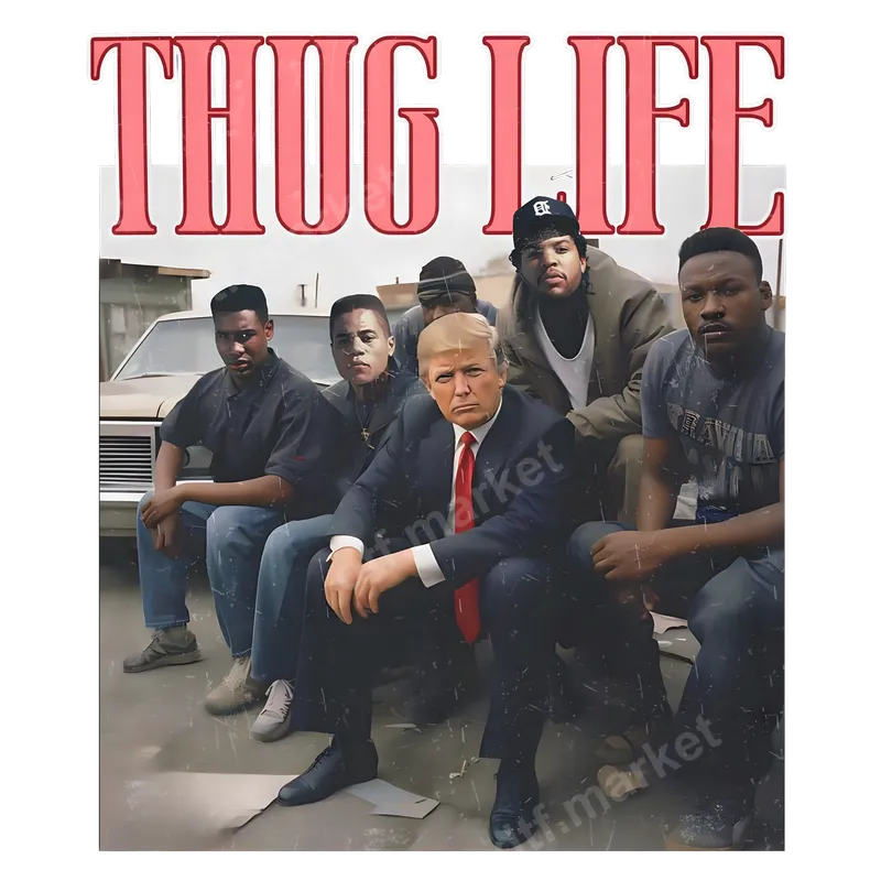 See allThis unique DTF transfer features a striking parody of the iconic N.W.A. 'Straight Outta Compton' album cover, humorously inserting Donald Trump into the group. The bold 'THUG LIFE' text crowns the image, adding to its provocative, meme-worthy appeal. This ready to press design combines political satire with classic hip-hop imagery, creating a standout visual for custom apparel projects. This heat press design is perfect for those who love to make a statement, appreciate political satire, or enjoy humorous pop culture mashups. It's ideal for meme enthusiasts, collectors of unique apparel, or anyone adding edgy humor to their wardrobe. Create a memorable gift for friends or family who enjoy controversial or satirical designs, suitable for casual outings or sparking conversation. Applying this ready to press transfer is incredibly easy, making it accessible for both beginners and experienced crafters. Our high-quality iron on decal works flawlessly on a wide range of fabrics, including cotton, polyester, and blends. For best results, use a heat press at 280-300°F for 6-10 seconds with medium pressure, then peel instantly. A household iron can also be used. Enjoy a professional finish without the hassle of weeding, common with traditional vinyl transfer designs. Experience superior quality with this apparel transfer, printed using professional DTF film. The colors are vibrant and sharp, ensuring your design truly pops. Our transfers are designed to be highly durable, crack-resistant, and wash-friendly, maintaining their integrity. The soft-touch finish ensures the design feels like part of the fabric, not a heavy patch. Trust in a professional heat transfer that adheres strongly and provides a long-lasting, premium look.