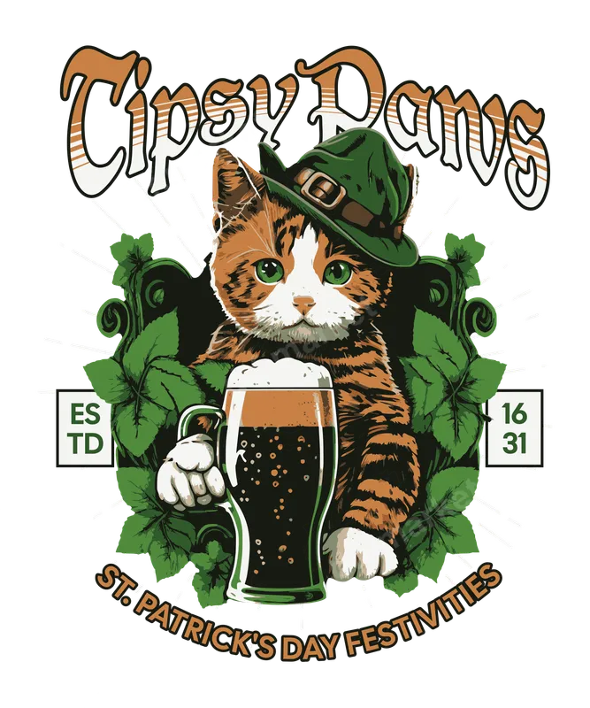See allThis charming DTF transfer features an adorable ginger tabby cat, donning a classic green leprechaun hat, holding a frothy pint of dark stout. The design, aptly titled "Tipsy Paws" with "ST. PATRICK'S DAY FESTIVITIES" curved below, is surrounded by vibrant green hop leaves, setting a cheerful and festive mood. This high-quality direct to film transfer is ready to press, making it easy to personalize your apparel for the upcoming celebrations. Perfect for cat lovers, beer enthusiasts, and anyone celebrating St. Patrick's Day, this heat transfer design is ideal for festive gatherings, pub crawls, or simply adding a touch of Irish cheer to your everyday wardrobe. It makes an excellent gift for friends, family, or even yourself, adding a unique twist to traditional holiday themes. Whether you're a proud cat parent or just love a good laugh, this design will surely be a hit. Applying this apparel transfer is simple with a standard heat press or even a household iron. For best results, use a heat press at 300-325°F for 15 seconds with medium pressure, then cold peel the film. No weeding or complicated layering is required, making your customization process smooth and efficient. Our versatile iron on transfers work beautifully on cotton, polyester, and various fabric blends. Crafted with professional-grade DTF film, this heat press design offers exceptional vibrancy, ensuring your colors pop on any garment. The transfers are incredibly durable, crack-resistant, and feature a soft hand feel that blends seamlessly with the fabric. Enjoy long-lasting wear and a professional finish with this superior t-shirt transfer, perfect for creating custom shirts, hoodies, or tote bags.