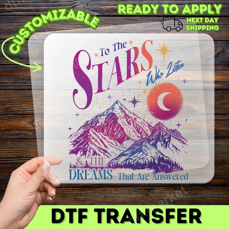 See allUnleash your inner stargazer with this captivating DTF transfer featuring the beloved quote, "To The Stars Who Listen & The Dreams That Are Answered." This design beautifully combines majestic gradient mountains, sparkling stars, and a luminous crescent moon, all rendered in vibrant purples, pinks, and oranges. It's a ready to press design that brings a touch of magic and inspiration to any garment. This unique design is perfect for fantasy book lovers, especially fans of the ACOTAR series, dreamers, and anyone inspired by celestial beauty and the power of ambition. It makes an exceptional gift for birthdays, book club gatherings, or simply to add a personalized, meaningful touch to your everyday wardrobe. Express your connection to the cosmos and the pursuit of dreams. Applying this heat press transfer is incredibly simple. It adheres beautifully to a wide range of fabrics, including cotton, polyester, and various blends. For best results, use a heat press at 300-325°F for 15 seconds with medium pressure, or follow the instructions for a household iron on transfer. There's no weeding required, making it a quick and effortless way to customize your apparel. Just press and peel! Our professional DTF transfers offer exceptional quality, providing a vibrant, soft-to-touch feel that's crack-resistant and highly durable. The strong adhesive ensures your shirt design stays put wash after wash. Elevate your style with this stunning apparel transfer, designed to last and inspire.
