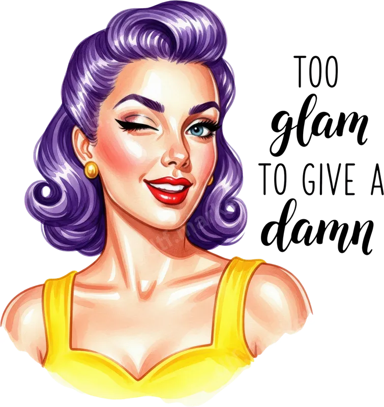 See allUnleash your inner diva with this fabulous "Too Glam To Give A Damn" DTF transfer, featuring a winking pin-up girl with vibrant purple hair and a sassy attitude. This eye-catching design is a perfect blend of retro charm and modern confidence, making it an ideal choice for anyone looking to express their bold personality. Our ready to press transfers ensure you get a high-quality, professional look with minimal effort. This vibrant design is perfect for confident women, fashionistas, and anyone who loves a touch of retro glam and humor. It makes a fantastic statement piece for casual wear, girls' nights out, or as a unique gift for birthdays, bachelorette parties, or just because. Easily customize t-shirts, tank tops, and other apparel with this fun iron on transfer that's sure to turn heads and spark smiles. Applying this direct to film transfer is straightforward. It works beautifully on a wide variety of fabrics, including cotton, polyester, and blends. Simply use a heat press at 300-325°F for 15 seconds with medium pressure. Even a household iron can achieve great results! The best part? There's no weeding required, making your customization projects quick and hassle-free. This heat press design saves you time while delivering stunning results. Crafted with premium DTF film and strong adhesive, this apparel transfer ensures vibrant colors that pop, crack-resistant durability, and a soft-to-touch finish. You'll love the professional look and feel of your customized garments. Enjoy long-lasting wear and washes, maintaining the transfer's integrity and bright appeal.