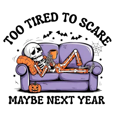 See allThe design features a relatable, weary skeleton lounging comfortably on a purple sofa, dressed in fun orange bone pajamas, holding a coffee mug. A mischievous pumpkin rests nearby, with bats and stars framing the scene. The bold text "TOO TIRED TO SCARE MAYBE NEXT YEAR" perfectly captures a laid-back, humorous Halloween spirit. This high-quality DTF transfer is ready to bring smiles and comfort to any garment. This funny iron on transfer is perfect for anyone who loves Halloween but prefers a cozy night in over frights. Ideal for introverts, busy parents, college students, or anyone with a sarcastic sense of humor. Make unique gifts for friends, family, or add a touch of anti-social charm to your own wardrobe for Halloween parties, casual fall outings, or just lounging at home. It’s also a fantastic heat transfer design for crafters and small businesses looking to create popular seasonal apparel. Our heat press transfer works seamlessly on a wide range of materials, including cotton, polyester, cotton-poly blends, and even nylon. Applying this design is quick and easy: use a heat press at 300-325°F for 15 seconds with medium pressure, or a household iron for smaller projects. There’s no weeding required—simply peel and press! It's perfect for custom t-shirts, hoodies, sweatshirts, tote bags, pillow covers, baby onesies, aprons, and denim jackets. For lasting durability, wash garments inside out and tumble dry low. This ready to press transfer delivers vibrant, full-color printing with exceptional fine detail. The design is crack-resistant and boasts a soft feel, without the heavy or rigid texture often associated with vinyl transfers. Each direct to film transfer is expertly printed on premium DTF film with a strong adhesive backing, ensuring professional-quality results for every application.