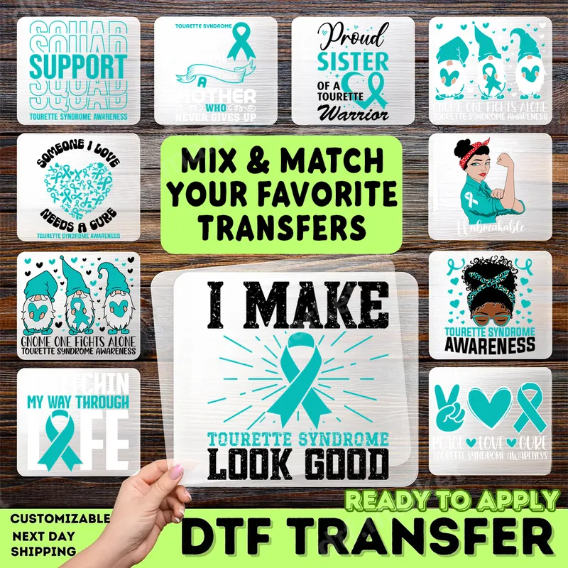 See allExpress solidarity and spread awareness for Tourette Syndrome with our inspiring collection of DTF transfer designs. Each ready to press graphic features the distinct teal ribbon, symbolizing support and hope. From empowering slogans like 'Squad Support' and 'Proud Sister of a Tourette Warrior' to charming gnome illustrations proclaiming 'Gnome One Fights Alone,' these designs capture a spirit of resilience and community. They are perfect for advocating for understanding and acceptance. These versatile heat press transfer designs are ideal for Tourette Syndrome Awareness Month, charity walks, fundraising events, or simply everyday wear to spark conversations. They make thoughtful gifts for individuals living with Tourette's, their family members, friends, and allies who want to show their unwavering support. Create custom apparel for support groups, advocacy teams, or as a personal statement of strength and love. Applying your new design is incredibly simple. Our premium iron on transfers are compatible with a wide range of fabrics, including cotton, polyester, and various blends. Use a heat press set to 300-325°F for 15 seconds with medium pressure, then perform a cool peel. No specialized skills or weeding required – just a quick, clean application process. For smaller projects or personal use, a household iron can also be used following careful instructions. Experience superior quality with our durable t-shirt transfers. Each direct to film transfer boasts vibrant colors that pop and a soft, flexible feel that won't crack or peel, even after multiple washes. Crafted from professional-grade DTF film with a strong adhesive, these apparel transfers are designed for longevity, ensuring your message of Tourette Syndrome Awareness remains bright and clear for years to come. Show your solidarity with confidence and style.