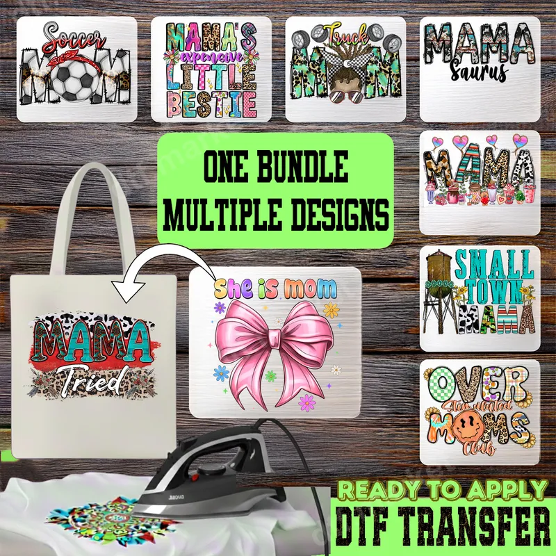 See allThis exclusive DTF transfer collection features nine trendy, heartfelt designs celebrating "Mama Life." From the sporty "Soccer Mom" and rustic "Small Town Mama" to humorous "Over Simulated Moms Club" and sweet "Mama's Expensive Little Bestie," each ready to press design showcases unique styles like leopard print, cow print, distressed textures, and vibrant watercolors. This diverse bundle is perfect for showcasing every facet of modern motherhood with flair, ideal for crafters and small businesses. Designed for proud mothers, grandmoms, stepmoms, or aunts, this versatile DTF transfer bundle is perfect for gifting or personalizing your own wardrobe. Ideal for Mother's Day, birthdays, or holidays, these heat transfer designs are fantastic for creating custom apparel for family events, sports games, or everyday wear. They also make excellent inventory for small business owners offering unique, high-demand t-shirt transfers. Applying these high-quality apparel transfers is straightforward. Our ready to press transfers work beautifully on cotton, polyester, and various blends. For best results, use a heat press at 300-325°F for 15 seconds with medium pressure, then cold peel. While a heat press is recommended, a household iron can also be used. Say goodbye to tedious weeding – these iron on decals are ready to apply! Experience premium quality with every direct to film transfer in this bundle. Each design boasts vibrant, pop-out colors and excellent durability, resisting cracks and fading after multiple washes. Our professional-grade DTF film ensures a soft touch, seamlessly integrating with fabric for comfortable wear. With strong adhesive, these custom transfers provide a long-lasting, professional finish on all your projects.
