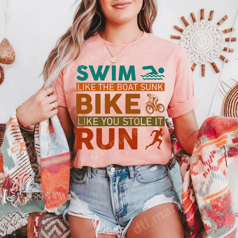 See allThis dynamic DTF transfer features an energetic "Swim Bike Run" design with motivational phrases: "Swim Like The Boat Sunk," "Bike Like You Stole It," and accompanying icons for each discipline. The vibrant teal, brown, and orange-red colors pop, capturing the spirit of triathlon and endurance sports with a touch of humorous urgency. This ready to press design is perfect for anyone passionate about multisport challenges and pushing their limits. Ideal for triathletes, cyclists, swimmers, runners, and fitness enthusiasts, this heat press transfer makes a fantastic statement piece. It's an excellent gift for race day participants, coaches, training partners, or anyone celebrating their athletic achievements. Perfect for personalizing gear for competitions, training sessions, or casual wear, this iron on transfer brings a bold, determined vibe to any event. Applying this high-quality t-shirt transfer is simple and efficient. It adheres beautifully to a wide range of fabrics, including cotton, polyester, and various blends, making it versatile for almost any garment. For best results, use a heat press at 300-325°F for 15 seconds with medium pressure, then perform a cool peel. For home users, a household iron can also be used following specific instructions. No tedious weeding or intricate layering is required, saving you time and effort. Experience professional-grade results with our durable DTF transfers. Each design boasts vibrant colors that remain brilliant wash after wash, resisting cracking and fading over time. The film is incredibly soft to the touch once applied, integrating seamlessly with your garment for a smooth finish. Crafted with strong adhesive, this apparel transfer ensures a long-lasting, high-quality decoration for all your custom projects.
