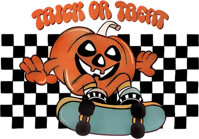 Trick or Treat Skater Pumpkin DTF Transfer | Retro Checkerboard Halloween