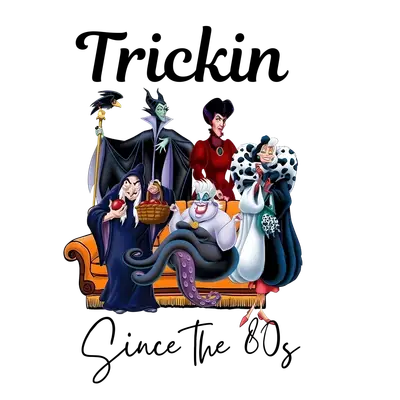 See allThis captivating DTF transfer features a squad of classic animated female villains – the Evil Queen (hag form), Maleficent, Lady Tremaine, Ursula, and Cruella de Vil – lounging together on an orange couch. Above and below them, the playful cursive text reads, 'Trickin' Since The 80s,' perfectly capturing a nostalgic, mischievous, and sassy vibe. This high-quality DTF transfer is vibrant, full of character, and a truly ready to press design, saving you time and effort for your next apparel project. This unique design is perfect for fans of classic animated films, especially those who appreciate a touch of dark humor and 80s nostalgia. It's an ideal choice for Halloween parties, themed events, or simply showcasing your wicked side year-round. It makes a fantastic, unexpected gift for friends, family, or even yourself. Craft custom apparel effortlessly with this premium iron on transfer, transforming plain garments into conversation-starting heat transfer designs. Applying this heat press transfer is a breeze. It works beautifully on a wide range of fabrics, including cotton, polyester, cotton-poly blends, and even nylon. For optimal results, use a heat press at 300-325°F for 15 seconds with medium pressure. No tedious weeding is required – just peel and press! Easily create custom t-shirts, hoodies, sweatshirts, tote bags, pillow covers, baby onesies, aprons, and denim jackets. For lasting durability and color vibrancy, wash finished garments inside out and tumble dry low. Experience superior quality with this ready to press transfer. It features vibrant, full-color printing with incredibly fine detail that truly pops on any fabric. The design is crack-resistant and soft to the touch, without the heavy, stiff feel often associated with traditional vinyl. Each direct to film transfer is printed on premium DTF film with a strong adhesive backing, ensuring professional, long-lasting results every single time.