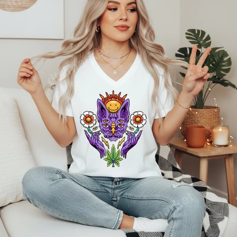 See allThis eye-catching DTF transfer features a vividly colored psychedelic cat with multiple eyes, crowned by a beaming smiley sun. Its hands cradle mystical flowers, while a prominent cannabis leaf grounds the design with a counter-culture vibe. This unique artistic expression is a perfect statement piece, delivered as a ready to press transfer for easy application. This design is ideal for individuals who embrace alternative aesthetics, stoner culture, and a love for vibrant, trippy art. It's perfect for festival wear, concert outfits, casual everyday style, or as a distinctive gift for friends who appreciate unique custom transfer designs. Whether for a birthday, holiday, or just to show off personal flair, this design truly stands out. Our high-quality heat transfer is incredibly versatile, adhering beautifully to cotton, polyester, and various fabric blends. Applying this design is simple: use a heat press at 300-325°F for 15 seconds with medium pressure, or follow instructions for a household iron. Unlike traditional vinyl transfer, there's absolutely no weeding required, making your customization process quick and hassle-free. Experience superior results with our professional-grade direct to film transfer. Each heat press design boasts incredibly vibrant colors that pop, is crack-resistant for long-lasting wear, and remains soft to the touch after application. Crafted with durable DTF film and strong adhesive, this apparel transfer ensures your customized garments look fantastic wash after wash.