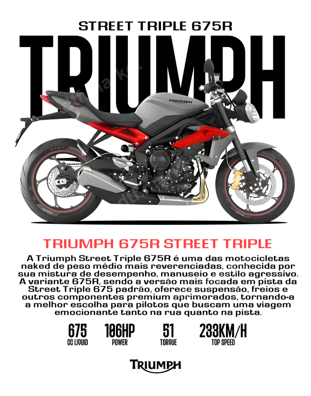 See allThis stunning DTF transfer features a highly detailed illustration of the iconic Triumph Street Triple 675R motorcycle, rendered in sleek gray and striking red accents against a bold background. Emblazoned with the prominent "TRIUMPH" logo and showcasing key performance specifications like "675 CC LIQUID" and "106HP POWER", this design captures the essence of a revered naked sport bike. It’s a premium, ready to press transfer, perfect for showcasing your passion for two wheels. Designed for the ultimate motorcycle enthusiast, this graphic is ideal for Triumph bike owners, sport bike riders, and anyone who appreciates high-performance engineering. It makes an exceptional gift for Father's Day, birthdays, or any special occasion for the biker in your life. Use it to personalize apparel for motorcycle rallies, track days, or simply to express your love for the open road. Our top-quality heat press transfer is incredibly versatile, working seamlessly on a wide range of fabrics, including cotton, polyester, and various blends. Application is a breeze: simply use a heat press at 300-325°F for 15 seconds with medium pressure, or apply with a household iron. Best of all, this iron on decal requires absolutely no weeding, saving you time and effort for a professional finish. Experience vibrant colors and exceptional durability with our professional-grade DTF film. This apparel transfer is designed to be crack-resistant, soft to the touch, and boasts strong adhesive properties for long-lasting wear. Create your own custom transfer garments that stand out with this high-quality, long-lasting design.