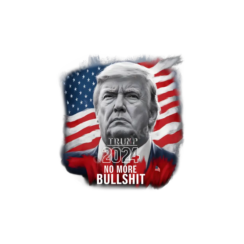 See allThe design features a stark, monochrome portrait of Donald Trump against a distressed American flag backdrop. Boldly displayed are the words "TRUMP 2024" and "NO MORE BULLSHIT," encapsulating a direct political message. This powerful image is rendered as a premium DTF transfer, a ready to press design perfect for making a strong statement. Its gritty, patriotic aesthetic is designed for those who want to express their convictions with impact. This direct to film transfer is ideal for ardent Trump supporters, political activists, or anyone looking to make a clear statement during election seasons. It's perfect for wearing to political rallies, campaign events, patriotic holidays like the 4th of July, or simply as a daily expression of your views. It also makes a unique gift for friends and family who share similar political sentiments, allowing them to personalize their apparel. Our versatile DTF heat transfer is engineered for effortless application on a wide range of materials including cotton, polyester, and blends. For a heat press, apply at 280-300°F for 6-10 seconds with medium pressure, then instant hot peel. A household iron can also be used for a durable iron on transfer. Unlike vinyl transfers, these ready to press designs require no weeding, saving you time and effort on every project. Experience superior quality with our professional-grade DTF transfers. Each apparel transfer boasts vibrant colors that pop, ensuring your message is seen clearly. They are crack-resistant, ensuring longevity and durability through countless washes, and maintain a soft, flexible feel on the garment. Crafted using robust DTF film and strong adhesive, these shirt designs provide a professional finish that stands the test of time.
