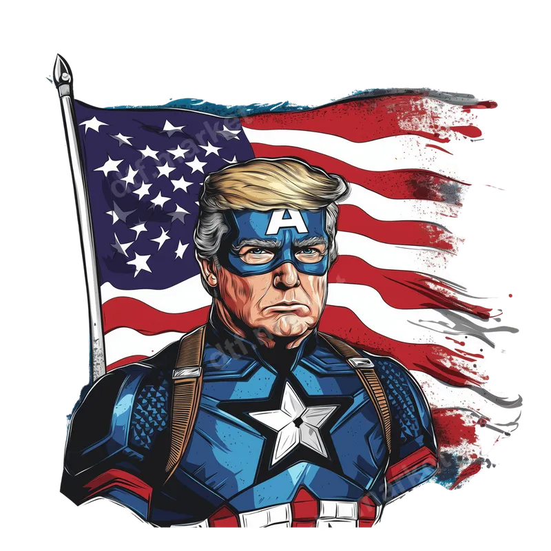 See allThis striking DTF transfer features a powerful depiction of Donald Trump reimagined as Captain America, complete with his iconic blonde hair, the superhero mask with an "A," and a battle-worn suit. Behind him, a distressed American flag waves, symbolizing enduring patriotism. This vivid and high-quality direct to film transfer is expertly designed and comes ready to press onto your chosen garment, delivering an impactful statement with ease. This unique heat press design is perfect for patriots, Trump supporters, and political enthusiasts looking to express their views with style. Whether for political rallies, Fourth of July celebrations, Memorial Day events, or simply everyday wear, this bold iron on transfer makes an undeniable statement. It's also an excellent gift idea for friends and family who share a love for American pride and conservative values. Applying this ready to press transfer is simple and efficient. It adheres beautifully to a wide range of fabrics including cotton, polyester, and cotton/poly blends. For best results, use a heat press at 280-300°F for 6-10 seconds with medium pressure, then instantly cold peel. You can also use a household iron with firm, even pressure. Unlike traditional vinyl, there's no tedious weeding required, making your customization project quicker and more enjoyable. Experience professional-grade quality with this apparel transfer. Our DTF film ensures a vibrant, crack-resistant design that feels soft to the touch and moves with the fabric. The strong adhesive guarantees a long-lasting print that withstands numerous washes, maintaining its crisp detail and bold colors. Elevate your wardrobe with a durable and eye-catching t-shirt transfer that truly stands out.