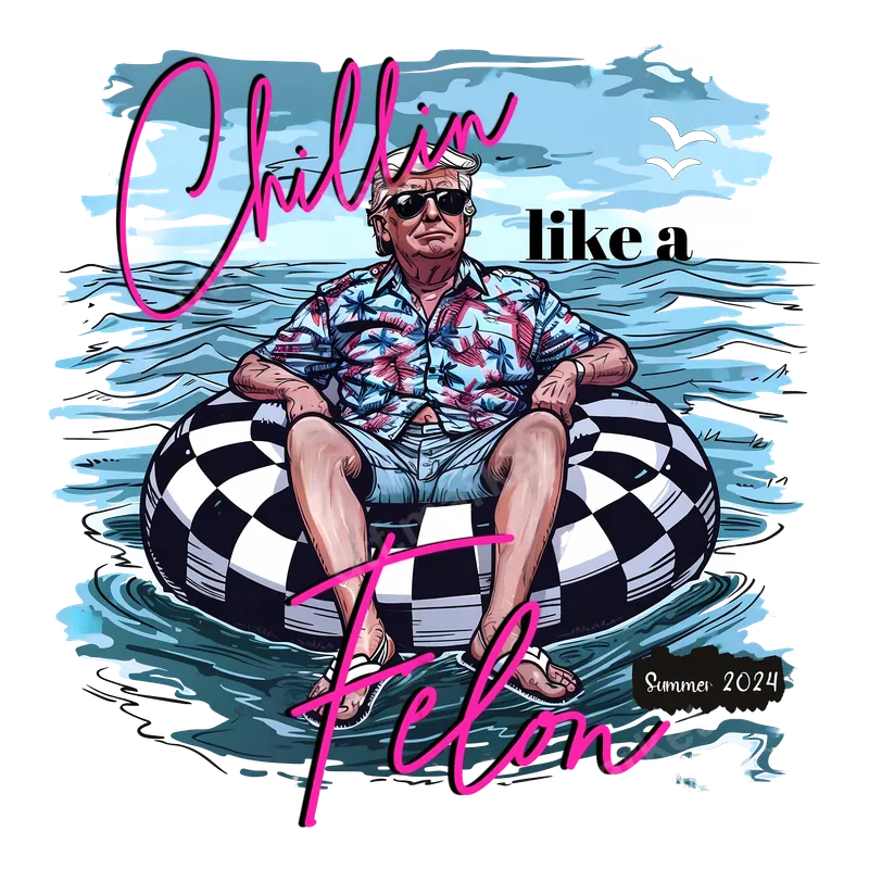 See allDive into summer with this hilariously bold 'Chillin' like a Felon' DTF transfer. This vibrant design features a caricature of a relaxed Donald Trump, sporting sunglasses and a Hawaiian shirt, floating effortlessly on a checkered inner tube amidst cool blue waters. The playful pink script declares "Chillin' like a Felon" with "Summer 2024" subtly noted, perfectly capturing a defiant yet laid-back vibe. It's a ready to press design that brings immediate attention and a touch of political satire to any garment. This unique t-shirt transfer is ideal for anyone looking to make a lighthearted political statement or simply loves a good meme. Perfect for summer parties, beach trips, or even casual everyday wear, it's a fantastic conversation starter. Gift this heat press ready design to friends who appreciate sharp political humor, or create custom apparel for protest events, rallies, or just to express your views with a smile. It’s an unforgettable way to wear your opinions. Our premium heat transfer is designed for easy application across a wide range of materials, including cotton, polyester, and various fabric blends. For best results, simply apply with a heat press at 280-300°F for 6-10 seconds with medium pressure, then enjoy an instant hot peel. You can even use a household iron for this iron on transfer, following our detailed instructions for a perfect finish every time. Forget tedious weeding; this custom transfer arrives ready to apply directly to your chosen item. Experience superior quality with this professional apparel transfer. Crafted from high-grade DTF film, it ensures vibrant colors that pop and remain brilliant wash after wash. The design is highly crack-resistant and offers a remarkably soft, flexible feel on the fabric, unlike traditional vinyl transfers. Our strong adhesive guarantees a long-lasting bond, ensuring your 'Chillin' like a Felon' statement stays sharp and impactful wherever you go.