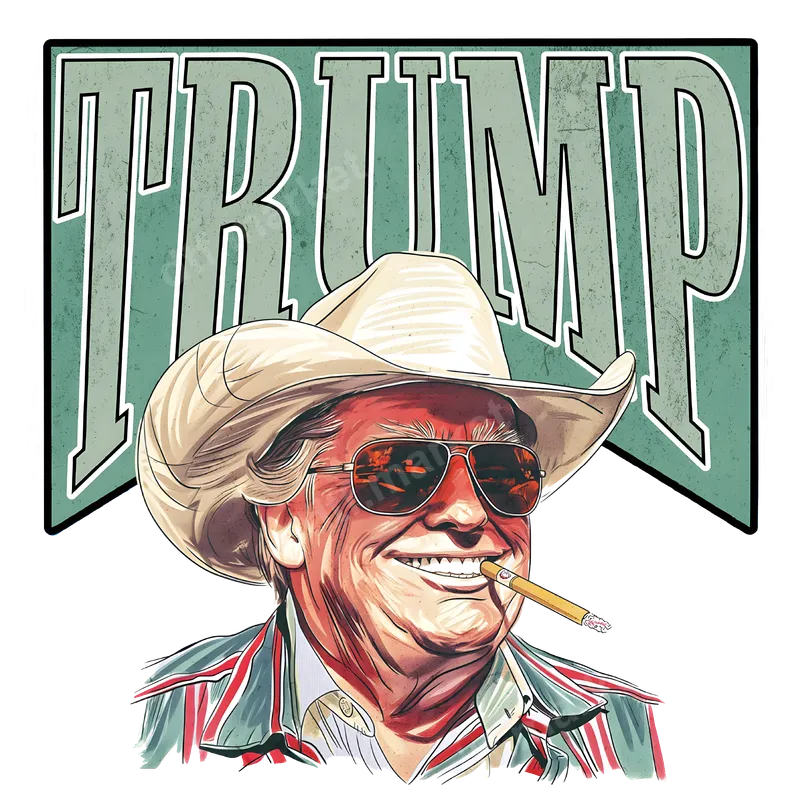 See allThis vibrant direct to film transfer features a stylized depiction of Donald Trump, exuding a confident, Western-inspired charm. He's portrayed wearing a classic cowboy hat and cool aviator sunglasses, with a subtle cigar in his mouth, all against a distressed background banner proclaiming "TRUMP." This ready to press design captures a bold, unapologetic spirit, making it a standout graphic for personal expression. Ideal for supporters, patriots, and anyone who appreciates a unique political statement, this heat press design is perfect for rallies, election events, casual wear, or themed gatherings. It makes an excellent gift for friends or family members who are fans, or for small business owners looking to create custom pro-Trump apparel. Perfect for showing conservative pride at any occasion. Our premium DTF transfer is incredibly versatile, working flawlessly on various fabric types including cotton, polyester, and blends. For best results, apply with a heat press at 280-300°F for 6-10 seconds with medium pressure, then perform an instant, hot peel. This iron on transfer requires no weeding, offering a smooth, professional finish with every application, making custom creations effortless. Experience superior quality with our durable direct to film transfers. Each transfer boasts incredibly vibrant colors, is highly crack-resistant, and feels remarkably soft to the touch once applied to your garment. Made with professional-grade DTF film and strong adhesive, these apparel transfers are designed to withstand countless washes, ensuring your custom shirts and accessories look fantastic for a long time.