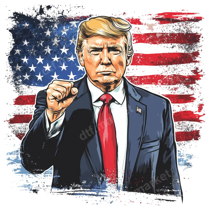 See allThis striking DTF transfer features a powerful illustration of Donald Trump against a distressed, grunge-style American flag background. The design captures a strong, determined stance, making it a perfect statement piece. It arrives as a high-quality, ready to press heat transfer, ensuring vivid colors and sharp details for your apparel. Ideal for supporters looking to express their political views, this heat press design is perfect for rallies, election events, patriotic holidays like the 4th of July, or everyday wear. It makes an excellent gift for fellow conservatives, veterans, or anyone passionate about American politics. Customize t-shirts, hoodies, hats, and bags with this impactful iron on transfer. Applying this ready to press transfer is simple and efficient. It works flawlessly on a wide range of materials including cotton, polyester, and cotton-poly blends. For best results, use a heat press at 280-300°F for 6-10 seconds with medium pressure and an instant hot peel. This direct to film transfer requires absolutely no weeding, saving you time and effort compared to traditional vinyl transfers. Our premium DTF transfers boast exceptional quality, providing vibrant, long-lasting colors that resist cracking and fading even after multiple washes. The professional-grade DTF film ensures a soft hand feel and strong adhesion to your garment, creating a durable and impressive finish. Elevate your custom apparel with this high-definition shirt design.