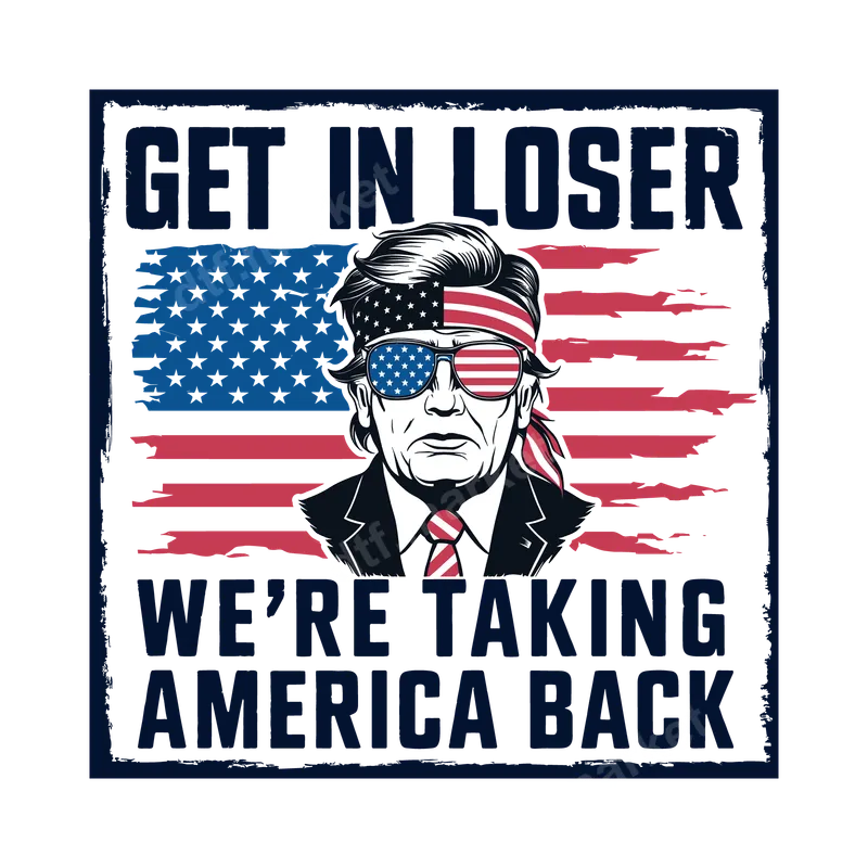 See allThis impactful DTF transfer features a stylized depiction of Donald Trump, sporting an American flag bandana and sunglasses, set against a distressed US flag backdrop. The bold declaration "GET IN LOSER WE'RE TAKING AMERICA BACK" encapsulates a strong patriotic and conservative sentiment. This ready to press design is perfect for making a clear statement and showing your unwavering support. It's a powerful graphic designed to stand out on any garment or accessory. This powerful heat transfer is ideal for supporters of Donald Trump and conservative political ideologies. It's perfect for wearing to political rallies, campaign events, or simply as an everyday expression of your beliefs. This design also makes a unique gift for politically active friends or family members who share a similar stance, suitable for patriotic holidays or election season. Show your pride and conviction wherever you go. Our premium iron on decal is designed for easy application on a wide range of fabrics, including cotton, polyester, and various blends. Achieve professional results with a heat press set to 280-300°F for 6-10 seconds with medium pressure, followed by an instant peel. For household iron users, detailed instructions are provided to ensure a perfect transfer. Best of all, there's no tedious weeding required, making customization quick and effortless. Experience superior quality with this t-shirt transfer, boasting vibrant, true-to-life colors that resist cracking and peeling even after multiple washes. The professional DTF film ensures a soft, lightweight feel on your garment, maintaining comfort and flexibility. Our strong adhesive guarantees a long-lasting bond, ensuring your design stays put and looks fantastic for years to come. You'll receive a durable, high-quality heat press design ready to transform your apparel.