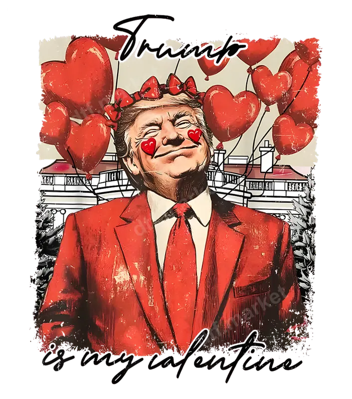 See allThis unique DTF transfer features a smiling Donald Trump adorned with playful red hearts on his cheeks and a crown of tiny bows, all surrounded by festive heart balloons. The iconic White House subtly frames the background, while the catchy phrase "Trump is my Valentine" is written in a whimsical script. This ready to press design perfectly blends political humor with classic Valentine's Day charm, making it a standout apparel transfer for any supporter. Perfect for political enthusiasts, satirical humor fans, or anyone looking to make a bold statement, this heat press transfer is ideal for Valentine's Day events, political rallies, or casual wear. It makes a fantastic gag gift, a fun conversation starter, or a unique present for a friend who appreciates a good political joke. Show your admiration or simply your sense of humor with this unforgettable design. Our high-quality heat press design can be easily applied to a wide range of fabrics, including cotton, polyester, and various blends. For best results, use a heat press at 300-325°F for 15 seconds with medium pressure. It can also be applied with a household iron with firm, even pressure. Unlike vinyl transfer methods, there's absolutely no weeding required, ensuring a quick and hassle-free application process. Experience vibrant colors, exceptional durability, and a soft-to-the-touch finish with every application. Our DTF transfers are printed on professional-grade film with a strong, flexible adhesive, ensuring your custom transfer resists cracking, peeling, and fading wash after wash. Transform any garment into a personalized, long-lasting statement piece with ease.