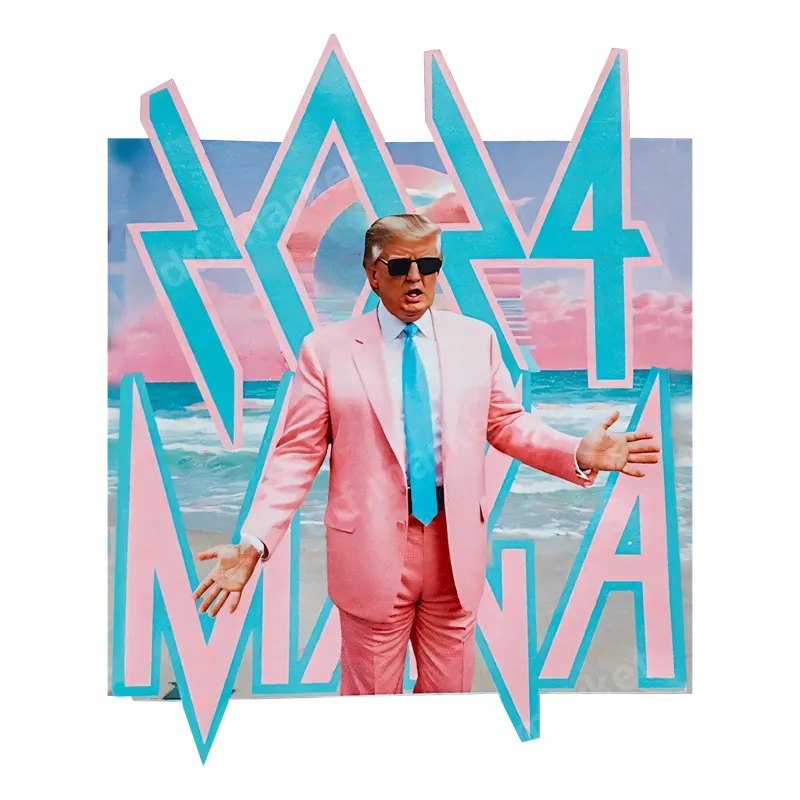See allThis vibrant DTF transfer captures a truly unique design featuring Donald Trump in a distinctive pink suit, blue tie, and sunglasses. He stands confidently against a backdrop reminiscent of classic 80s Miami Vice aesthetics, complete with a beach scene, pastel colors, and bold, neon-style "MAGA" lettering in teal and pink. This high-quality, ready to press design fuses political commentary with retro pop culture, making for an unforgettable statement piece that’s both humorous and stylish. This eye-catching heat transfer is perfect for individuals who appreciate political satire, 80s nostalgia, or anyone looking to add a truly unique and humorous touch to their wardrobe. It's an excellent choice for rallies, themed parties, casual wear, or as a conversation starter. Gift this distinctive iron on transfer to friends or family members who enjoy unique political memorabilia, retro fashion, or a good laugh. It's also ideal for small businesses and crafters creating custom apparel for special events or online shops. Applying this apparel transfer is incredibly easy and hassle-free, making it suitable for both experienced crafters and beginners. Our heat press ready transfers work beautifully on a wide range of materials, including cotton, polyester, and various blends. For optimal results, use a heat press at 280-300°F for 6-10 seconds with medium pressure, then perform an instant, hot peel. You can also achieve great results with a household iron, ensuring even pressure across the design. Unlike traditional vinyl transfers, there's absolutely no weeding required, saving you significant time and effort. Experience superior quality with our premium direct to film transfers. This design boasts incredibly vibrant colors that pop and sharp details, ensuring your finished product looks professional and stands out from the crowd. Engineered for durability, our transfers are crack-resistant, wash-fast, and designed to maintain their integrity over countless wears and washes. The professional-grade DTF film provides a soft hand feel and a strong adhesive, ensuring a lasting bond with your garment without the stiffness often associated with other transfer methods.